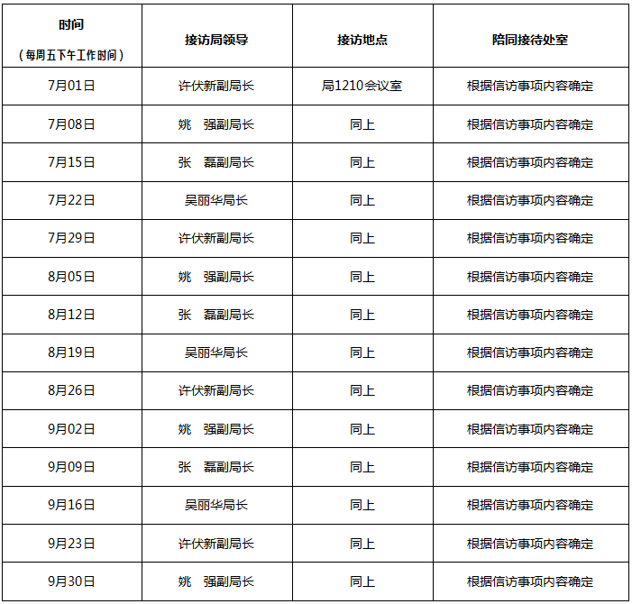 备注为提高信访接待质量,来访人应事先联系并提交相关信访资料,经审核确需现场接访的,安排局领导及相关处室陪同接访;如属一般性信访事项或投诉咨询,经来访人同意,可按一般程序直接交相关职能处室办理。局领导工作分工详见AG真人网站“AG真人娱乐娱乐”栏目。信访联系电话:,邮箱: